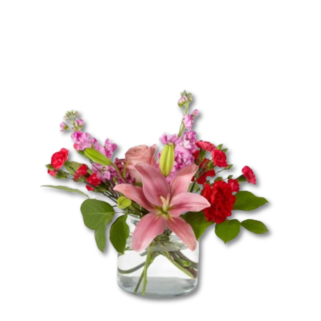 Cozy up with the one who matter most with the Date Night In Bouquet. This delicate display of red carnations, light pink stock, pink lilies, and roses designed in a clear cinched vase will bring romance to your sweetheart and your space.