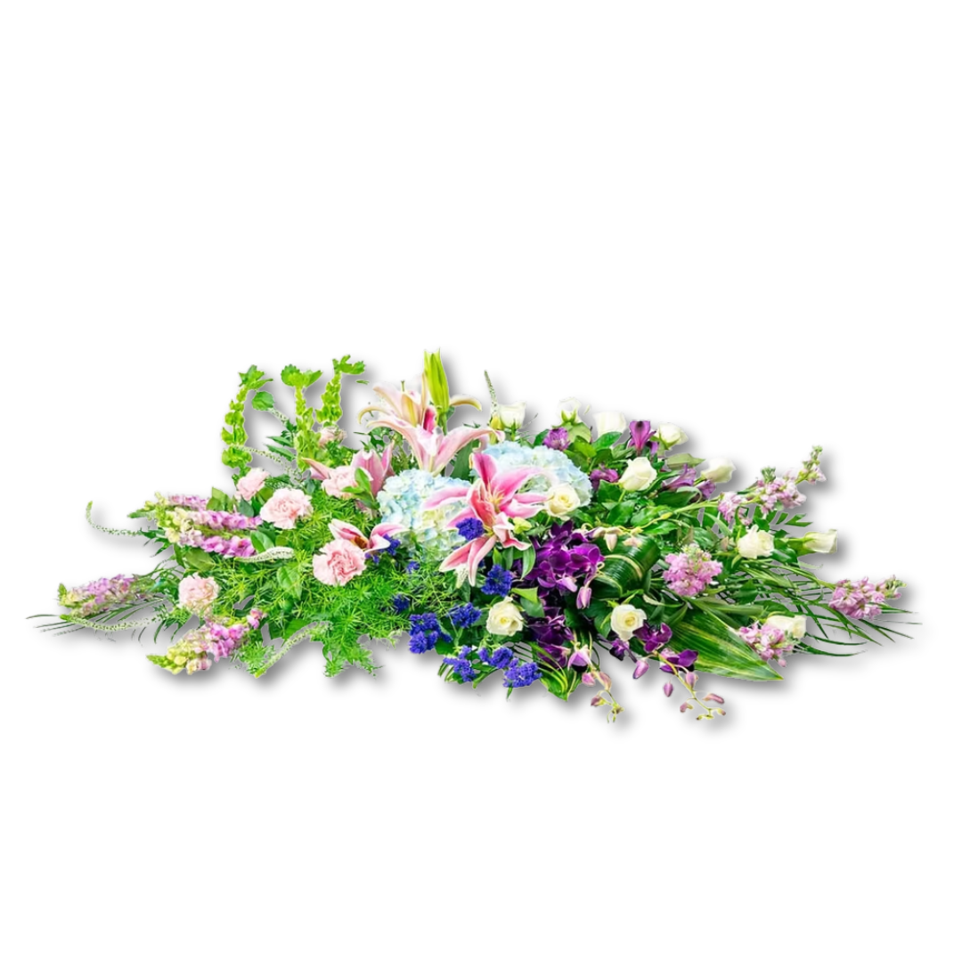 This beautiful casket spray featuring Hydrangeas, Snap Dragons, Orchids, Robellinis, and Lillies is a perfect way to celebrate the life of a loved one.