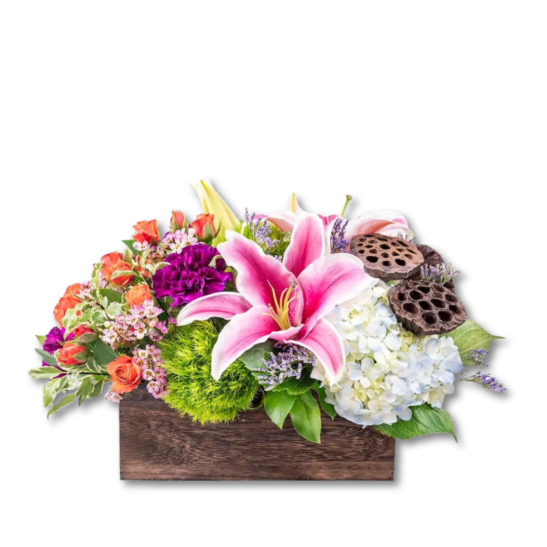 Arranged in a beautiful wooden box, this arrangement consists of Hydrangeas, Roses, Carnations, with accents of Green Trix and Lotus Pods. Brighten up someones day with this beautiful way to say you love them!