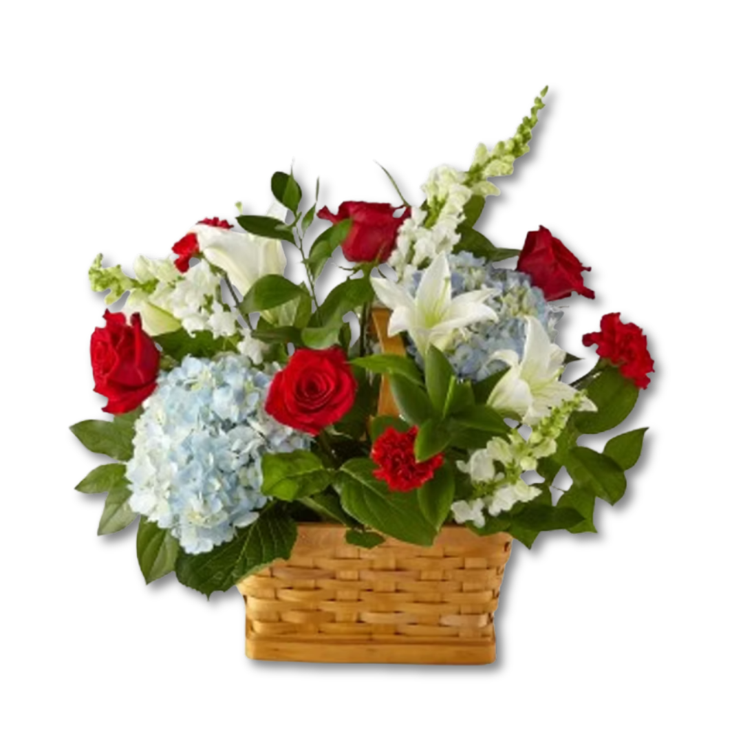 Designed by our florists, this arrangement features a patriotic display of blue, red and white florals. Whether it's to honor the life of someone who served our country or comfort a family member, this arrangement makes a fitting gift for a tabletop display at the service or delivered to a loved one's home.