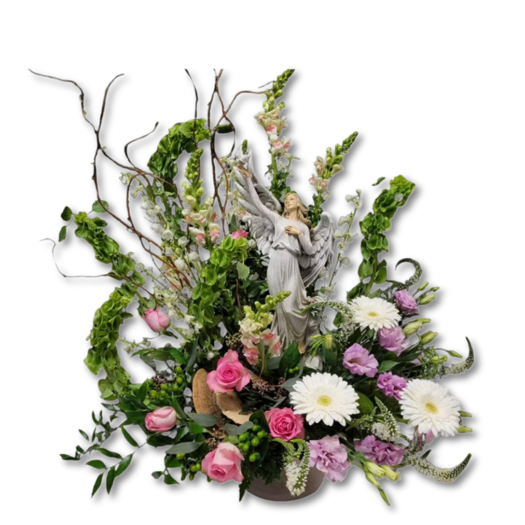 The Heaven Sent Arrangment is a beautiful tribute to lost loved one featuring a peaceful angel figurine or just for a beautful everyday arrangement!