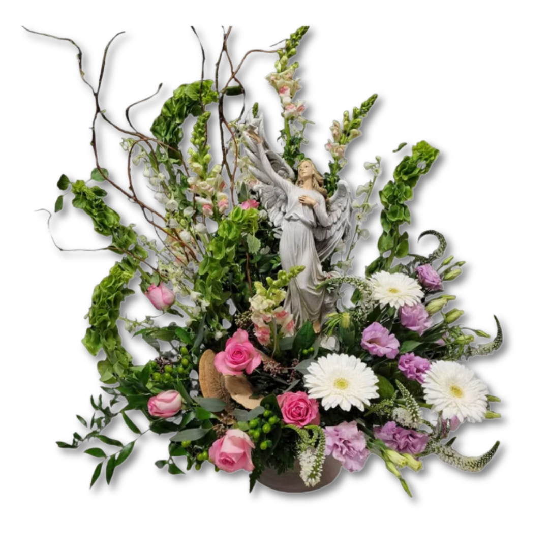 The Heaven Sent Arrangment is a beautiful tribute to lost loved one featuring a peaceful angel figurine or just for a beautful everyday arrangement!