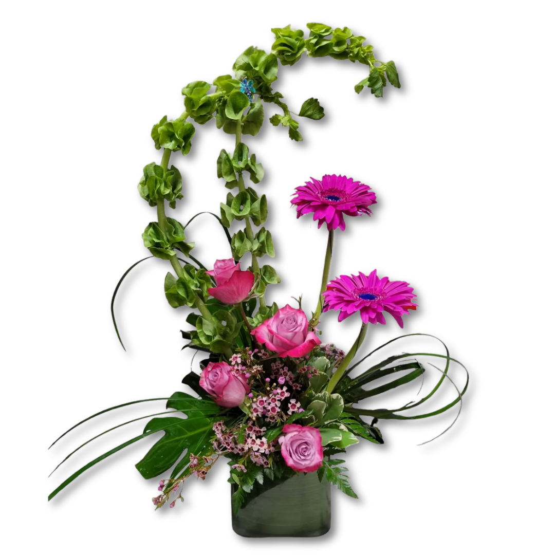 This beautiful arrangement will brighten anyones day! With bright pinks and vibrant greens adorned with a dragonfly charm, this arrangement makes the perfect gift.