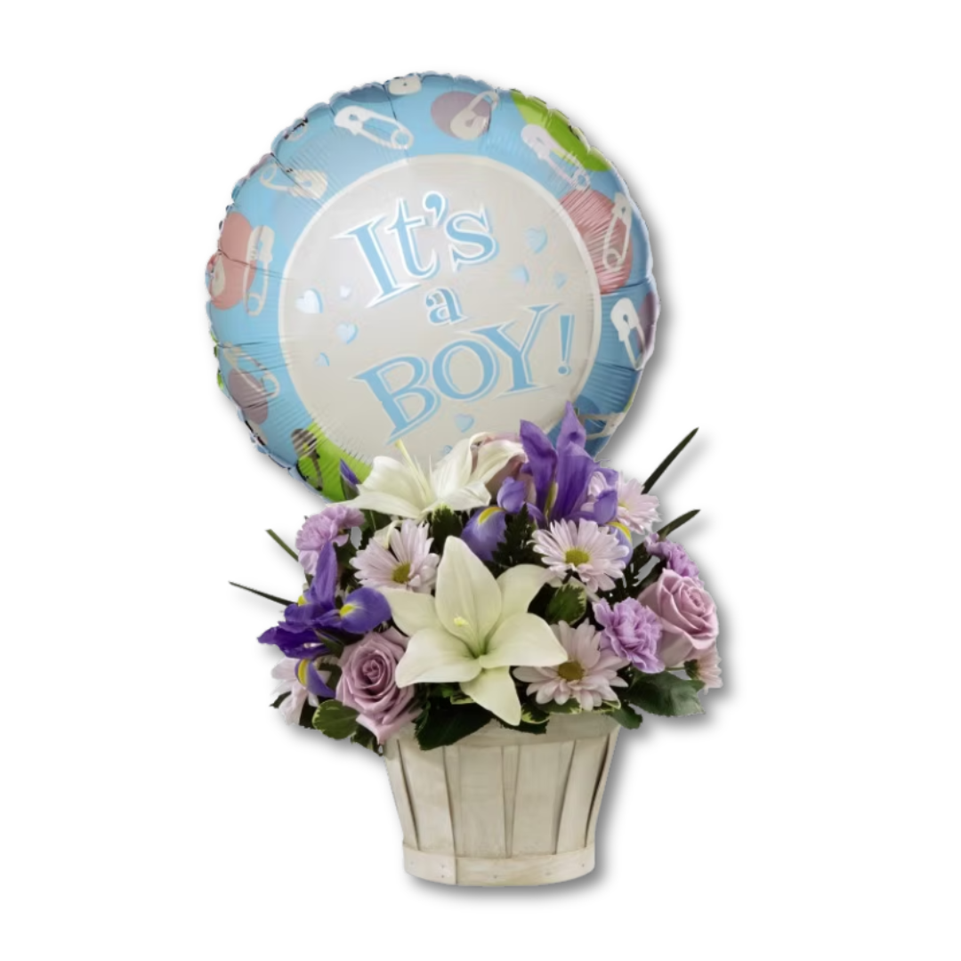 The FTD® Boys Are Best!™ Bouquet is blooming with sweet love to congratulate the new family on their darling baby boy! Lavender roses, blue iris, lavender carnations, lavender daisies, white Asiatic lilies and lush greens are beautifully arranged in a round whitewash woodchip basket. Presented with a Mylar balloon declaring, "It's a Boy!" this incredible flower arrangement is the perfect welcome for their new addition.